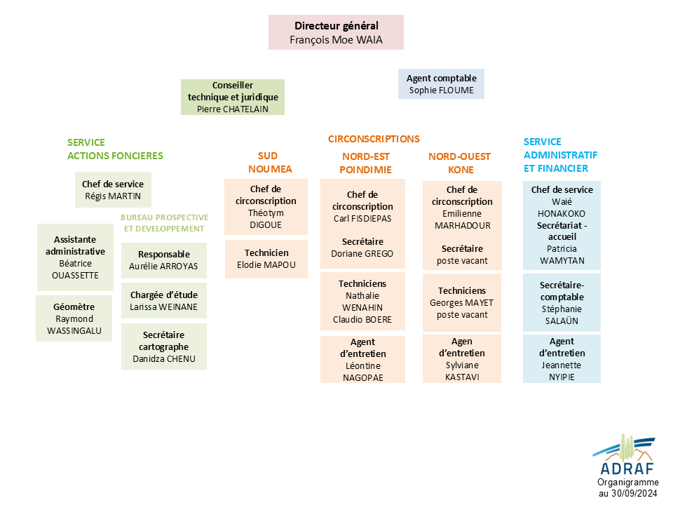 L'Agence est composée de 25 agents répartis entre le siège à Nouméa et les 3 circonscriptions Sud, Nord-Est et Nord-Ouest dont les bureaux sont installés respectivement à Nouméa, Poindimié et Koné.