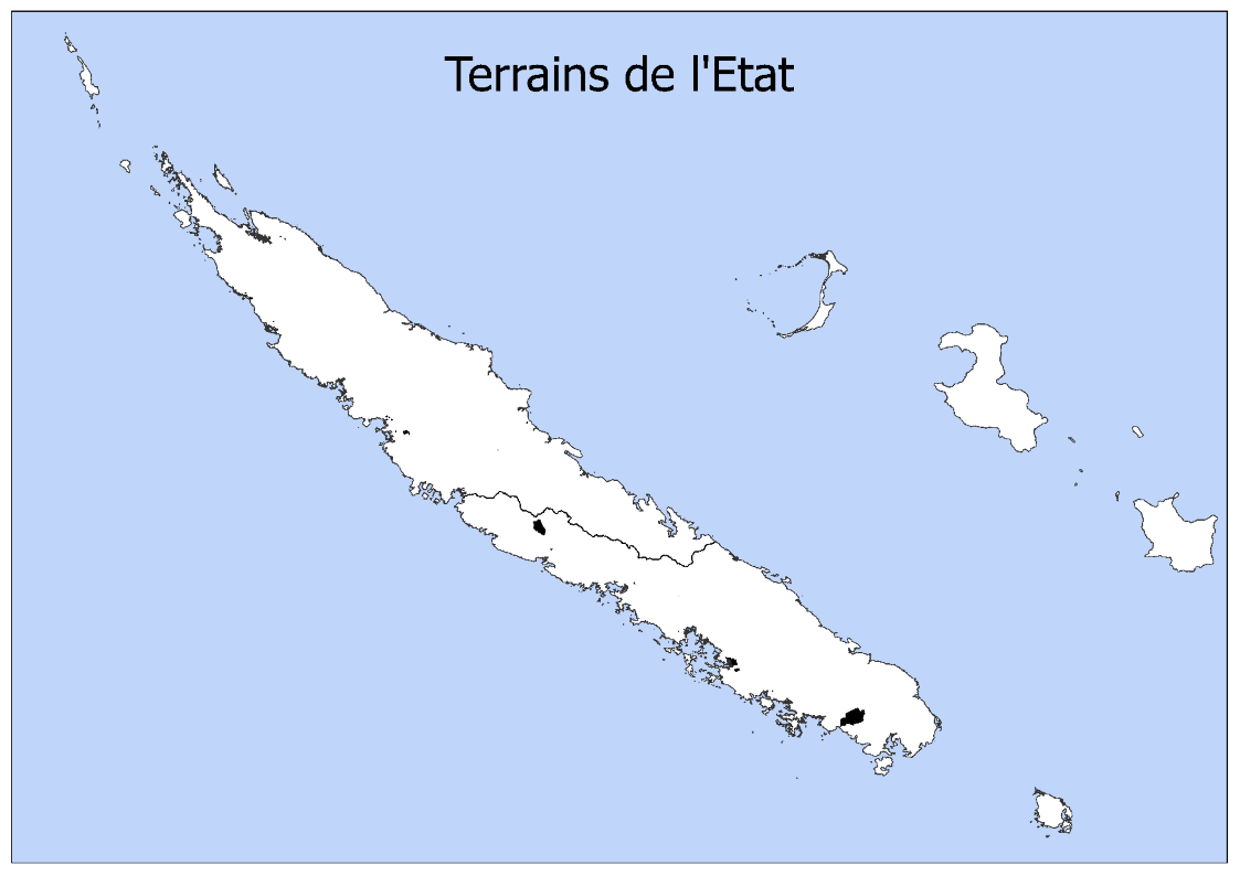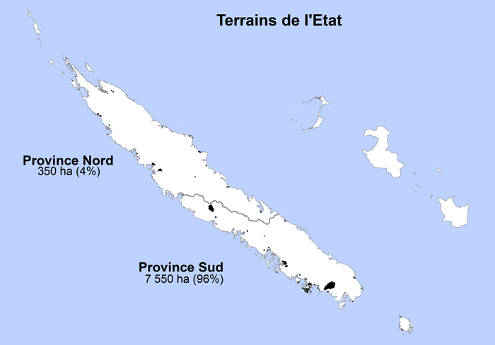 L’Etat ne conserve qu’un domaine très réduit : des terrains militaires (Nandaï, SMA de Koné et Koumac, Plum, gendarmeries, etc.) et les bâtiments nécessaires à l’exercice de ses compétences (services du haut-commissariat, trésorerie, palais de justice, etc.).